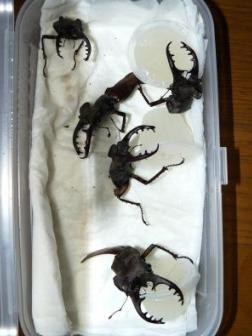 樹液をたっぷり出しているクヌギが結構多く見られました(昼間)。 もしかしたらと思い、22日土曜日の夜採集に出かけて・・・・・。 今年一番の成果でした。♀は全部スルーして♂だけで、 ミヤマ(55~64)9頭、ノコ(短歯はスルー)中歯4頭長歯(水牛)3頭 ヒラタ(54・62)2頭、カブト(小~大)16頭採れました。 シーズンが過ぎているので、他の採集者がいなかったことも有りますが、 盆過ぎてこれだけの種類と数が採れたのは40年採集してきて初めてです。 今年は6月半ばにミヤマ♂とカブト♂が採れて驚いていたのですが・・・・・。 30日の夜も各♂数頭づつ採れて、結局異常気象のおかげで? 長く採集出来ましたが、来年以降とても不安を感じてます。 23日の午前中に22日に行けなかったミヤマのポイントに行ったとき、 十数頭の頭だけのミヤマがアリにたかられていて(梟にやられたのか?)、 数頭まだ生きていたので、持ち帰ったのですが、最長3日生きてました。 PR
